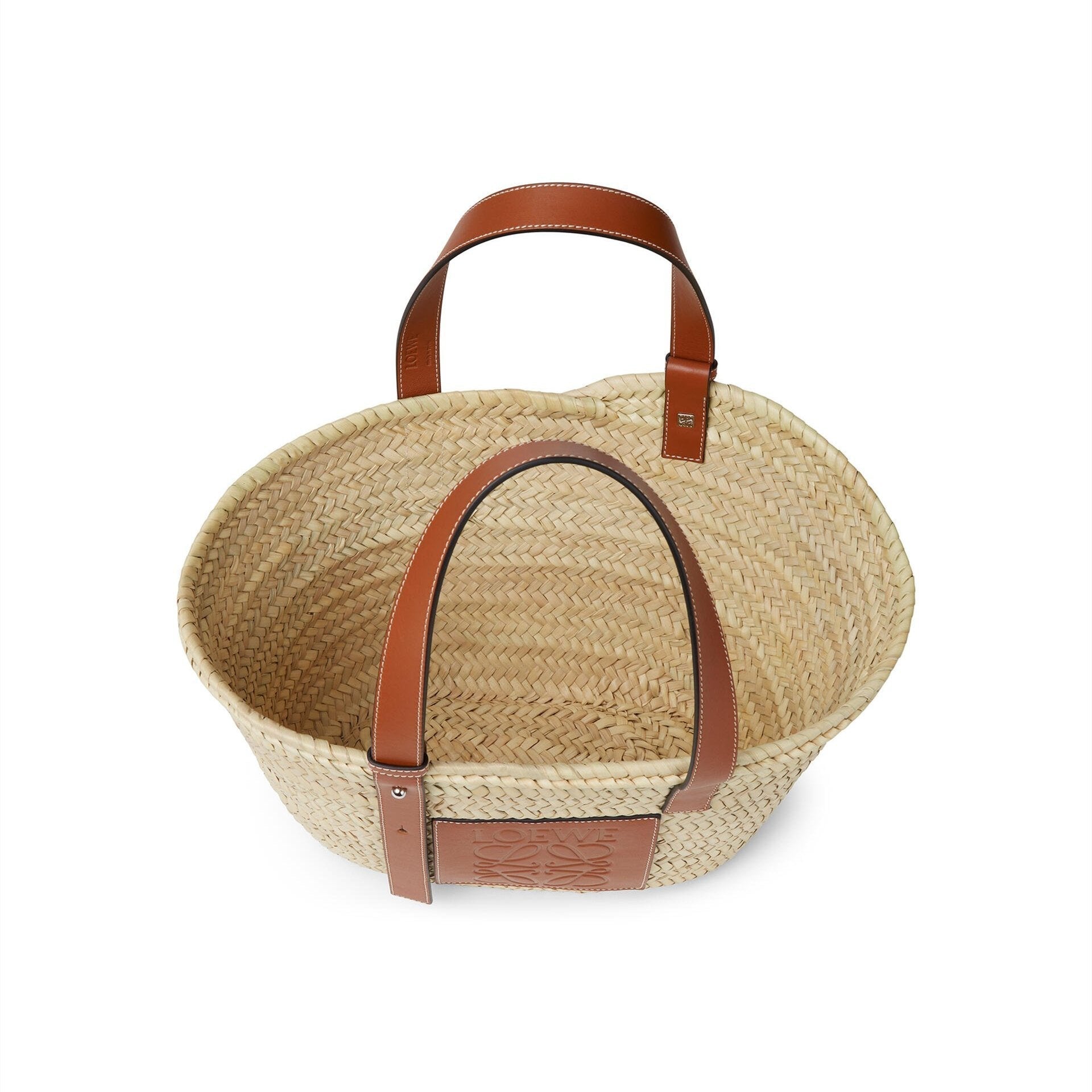 A traditional basket bag with a classic hand-woven body and a beautiful calfskin top handle.