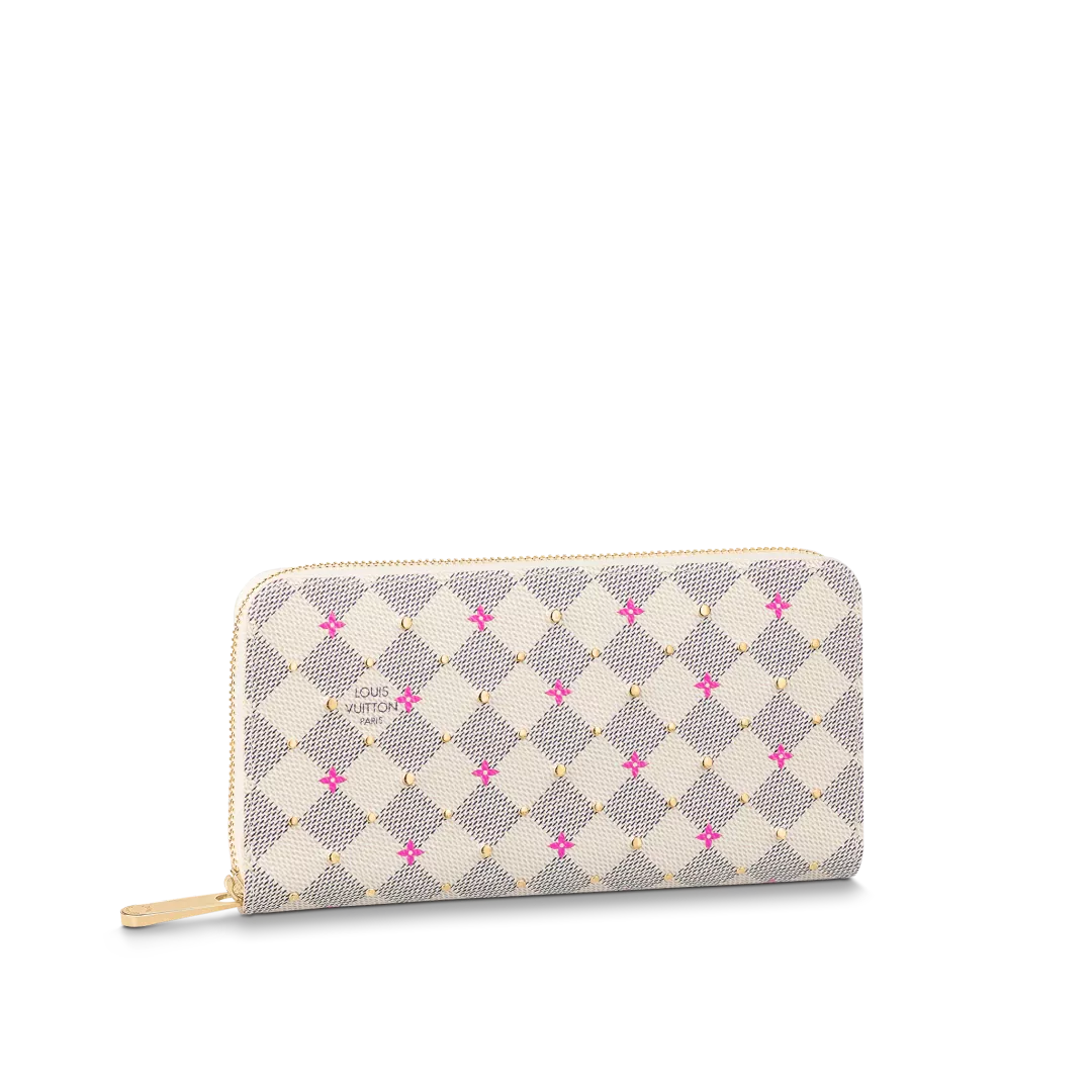 • “Zippy Wallet” reinterpreted for the “Damie Azul Studs” collection. Damie Azul canvas with fuchsia pink floral motif print and small gold-coloured studs. The contrasting pink lining that emerges when you open the reassuring round zipper and the interior with multiple compartments, pockets and card slots are also attractive.