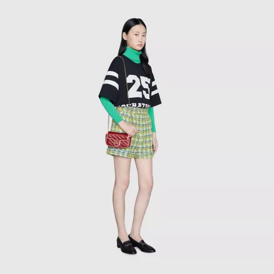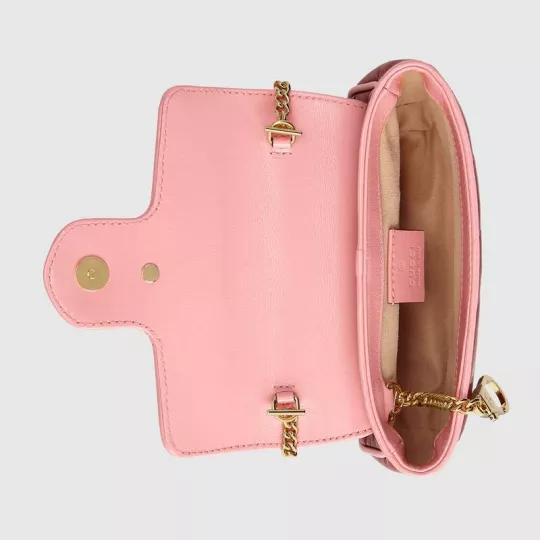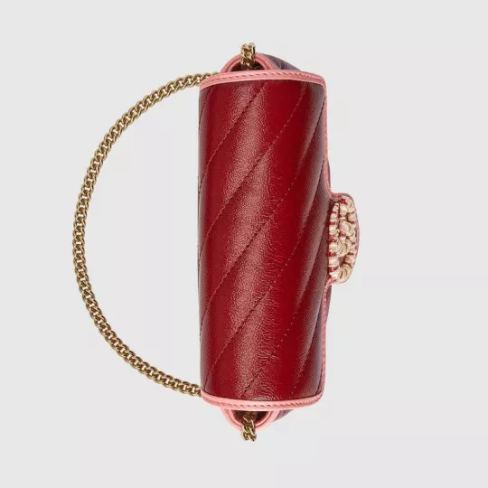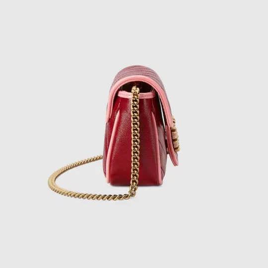 This GG Marmont series super mini handbag is made of red and pink quilted leather, showing the beauty of stunning contrast. The darling of the brand Gucci has opted for a series of brightly toned designs inspired by precious gemstones, minus a variety of outstanding styles from the Infinite Overture series. The iconic double-G accessory with enamel details adds to the overall appeal of the design.