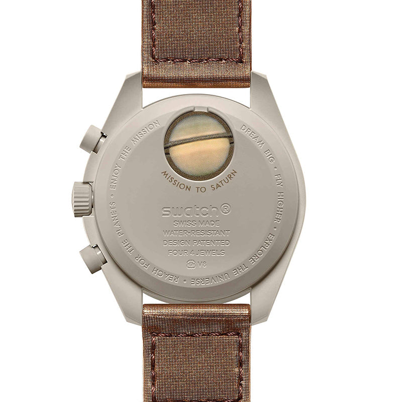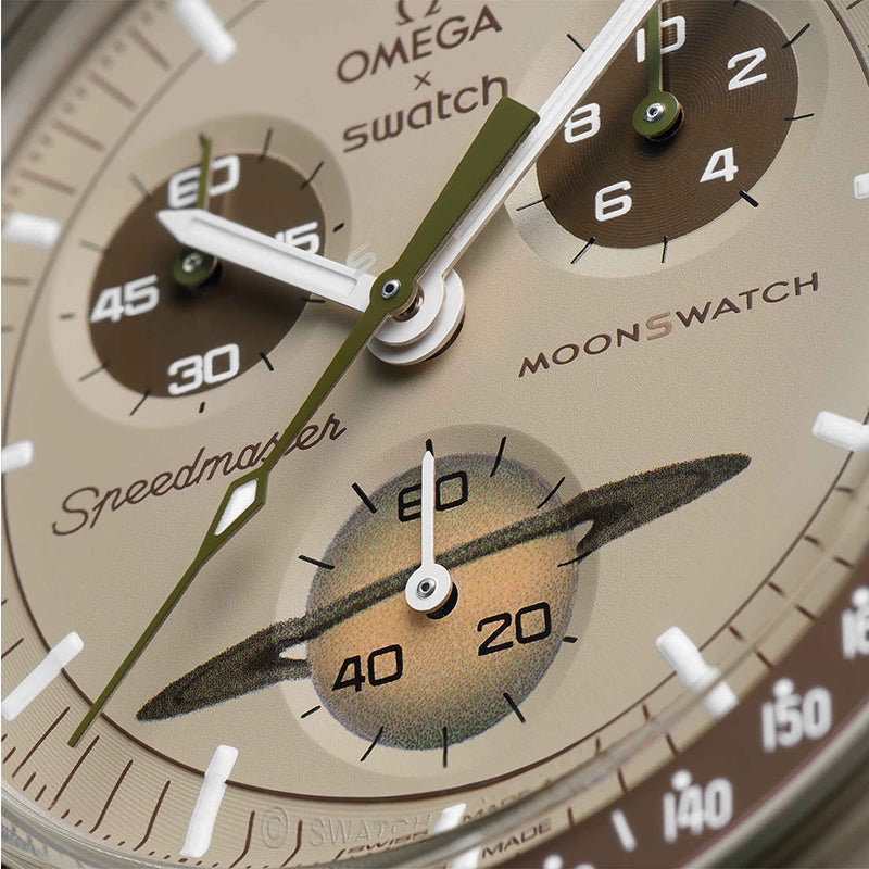 In this model, the sand beige tones contrast wonderfully with the brown dial and VELCRO© strap. The chronograph second hand, subdial hand, and tachymeter scale have a brown background. The second subdial depicts Saturn’s rings. On all watch faces, you’ll see the OMEGA X SWATCH lettering, the iconic Speedmaster logo, and the new MoonSwatch logo. The glass structure integrates the letter S hidden in the center of the crystal. The outer ring and sub-dial of the dial have a delicate and sophisticated circular pattern, a sharp and smooth lug structure, the bezel with tachymeter graduation features the iconic “dot over 90” detail, and of course, a unique touch of bioceramic. These are common to all models and reflect a passion for detail. All hour and minute hands, chronograph seconds and hour markers are super-LumiNova so they shine perfectly in the dark.