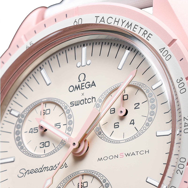 A crisp and bold watch with a white VELCRO© strap that perfectly complements the light pastel pink. On the edges, an oval sub-dial adorned with diamond-like details adds a touch of feminine elegance. The hour and minute hands, the second hand of the chronograph, and the hands of the counter are also pink. On all watch faces, you’ll see the OMEGA X SWATCH lettering, the iconic Speedmaster logo, and the new MoonSwatch logo. The glass structure integrates the letter S hidden in the center of the crystal. The outer ring and sub-dial of the dial have a delicate and sophisticated circular pattern, a sharp and smooth lug structure, the bezel with tachymeter graduation features the iconic “dot over 90” detail, and of course, a unique touch of bioceramic. These are common to all models and reflect a passion for detail. All hour and minute hands, chronograph seconds and hour markers are super-LumiNova so they shine perfectly in the dark.
