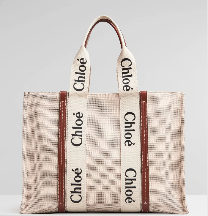 “WOODY” medium tote bag made of cotton canvas and shiny calfskin with “WOODY” ribbon